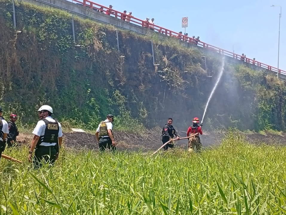 Agentes de la Policía Nacional y efectivos del Cuerpo de Bomberos acudieron al lugar para sofocar las llamas y evitar que se expandan hacia viviendas y otras áreas cercanas.